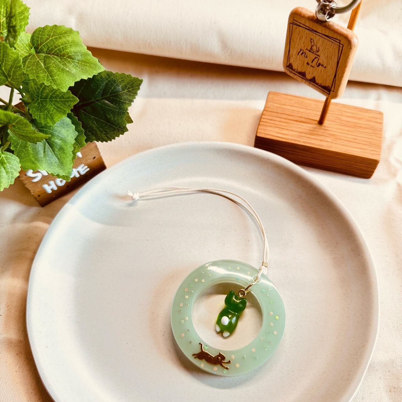 小さな猫ちゃんがちょこんと座る、まあるいレジンチャーム。